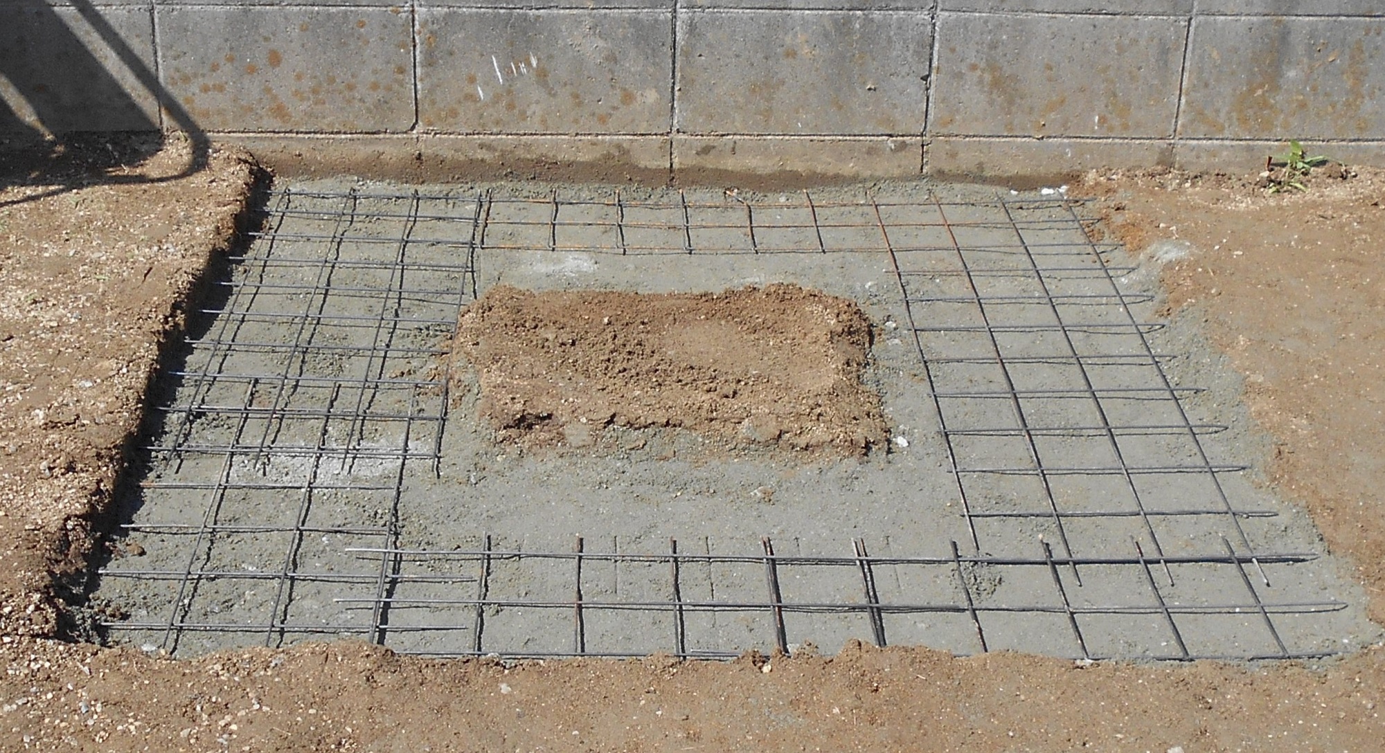 基礎に強度を持たすために砕石の上からコンクリートを塗り鉄筋を入れます。手前のパイプは雨水の抜け穴です。