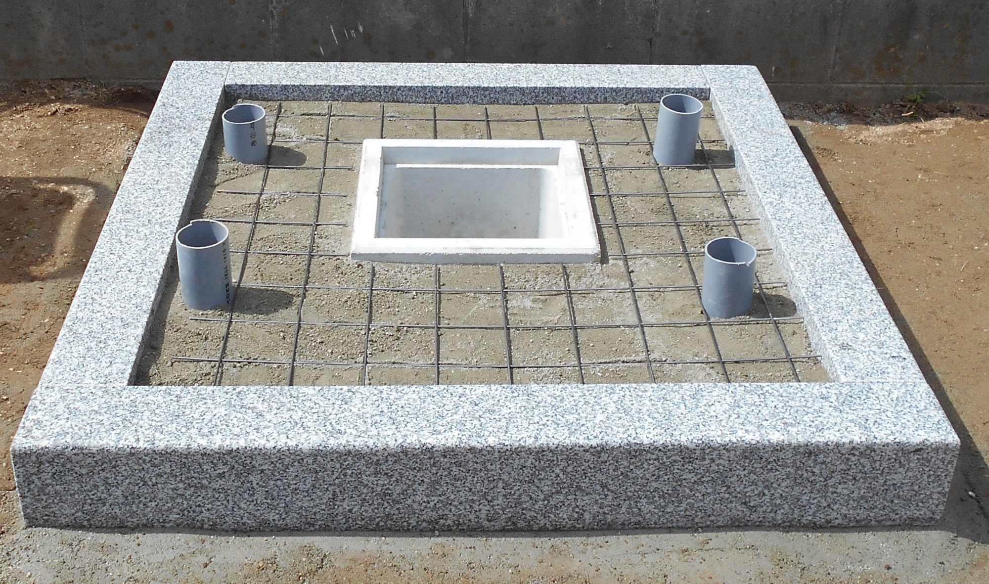 さらに基礎に強度を持たすために砕石の上からコンクリートを塗り、鉄筋を入れます。パイプは雨水の抜け穴で、中央はカロート(納骨室)です。