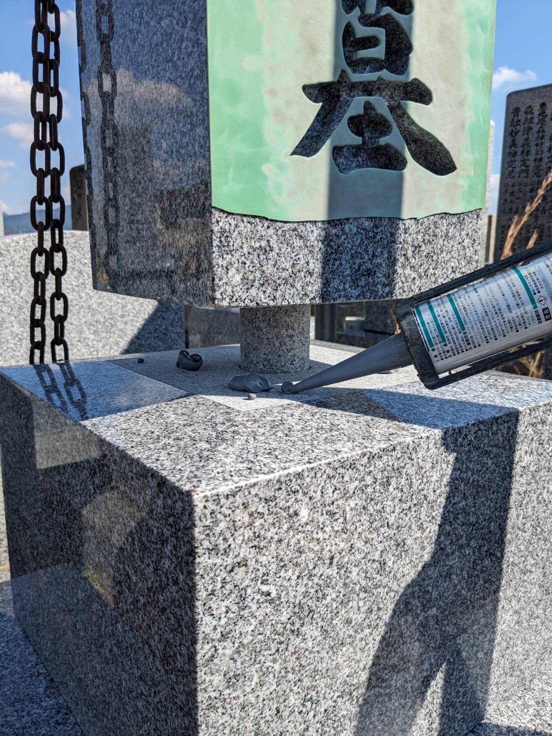 円柱型の御影石の耐震棒を入れて耐震強度を上げています。さらに柔軟性と密着性を備えた耐震性の高い樹脂接着剤を使用しています。 (場所)天理市