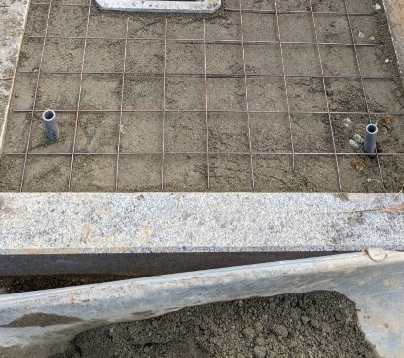 基礎に強度を持たすために砕石の上からコンクリートを塗り鉄筋を入れます。手前のパイプは雨水の抜け穴です。